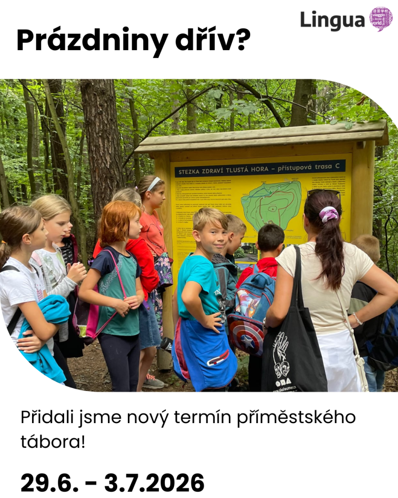 Reagujeme na tuto změnu a pro děti jsme nově přidali termín příměstského tábora, který proběhne v týdnu od 29. 6. do 3. 7. 2026. Tábor je skvělou příležitostí, jak si užít začátek prázdnin aktivně, zábavně a zároveň s angličtinou. Přihláška na příměstský tábor ZDE.